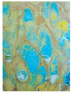 No encontramos diferencias significativas en el fenotipo del infiltrado inflamatorio. En todas las formas de mucinosis folicular la mayor parte de los linfocitos expresaba marcadores T4 (fig. 10), siendo muy escasa la celularidad B y T8. La expresión de S-100 en el epitelio y dermis papilar no se encontraba incrementada.