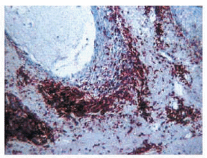 Con el objeto de determinar la naturaleza del infiltrado inflamatorio efectuamos tinciones inmunohistoquímicas de biopsias seleccionadas. Se realizaron técnicas de inmunohistoquímica en secciones de tejido incluido en parafina, utilizando técnicas de fosfatasa alcalina y estreptoavidina marcada con peroxidasa. El panel de anticuerpos monoclonales incluyó antígenos asociados a linfocitos B (L26-CD20), linfocitos T (Leu 4-CD3), célula de Langerhans (s-100), linfocitos T colaboradores (CD4), linfocitos T supresores (CD8).