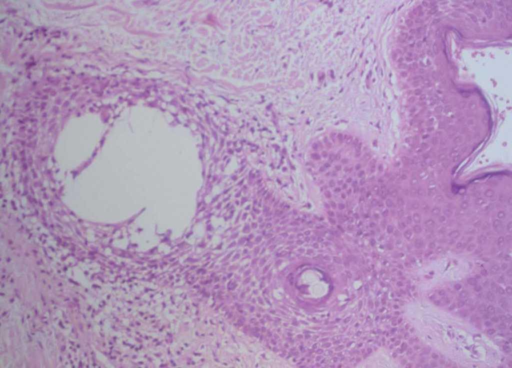 Fig. 2.—Infiltrado linfocitario perifolicular con grandes espacios quísticos con pérdida de conexión entre los queratinocitos foliculares. (Hematoxilina-eosina, ×100.)