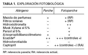 El fotoparche se realizó con una lámpara de luz PUVA 500 (Herbert Waldmann, Germany) irradiando durante 30 min (9 J/cm2 ) la batería de alérgenos homologada por el Grupo Español de Fotobiología, que se aplicó por duplicado, retirando los parches a las 48 h e irradiando sólo la mitad de ellos. Además se parchearon por duplicado en vaselina al 1 %, el Eca-zide® , Captopril e hidroclorotiazida, estos dos últimos amablemente facilitados por el servicio de farmacia de nuestro hospital.