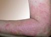 Una mujer de 50 años consultó en octubre de 2000 por una erupción muy pruriginosa de unos 2 meses de evolución. A la exploración se observaban placas eritematosas, confluentes, infiltradas, de aspecto eczematoso y de predominio en áreas fotoexpuestas: tercio inferior de los brazos, antebrazos, escote, parte superior de la espalda y piernas (fig. 1). La paciente había sido tratada de forma ambulatoria con corticoides orales a dosis bajas sin mejoría clínica. Como antecedentes personales destacaba una hipertensión arterial en tratamiento con Ecazide® (captopril + hidroclorotiazida) desde hacía 2 años e hipercolesterolemia en control dietético.