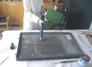 4.Restauración de los distintos componentes: a) molde: limpieza del molde con una disolución de jabón neutro al 2 % en agua destilada. Seguidamente se realiza otra, esta vez más específica, con una disolución de agua destilada y amoníaco al 10 % para la eliminación de la suciedad más persistente. Una vez limpio se procede a la consolidación del molde mediante unión de fragmentos, reconstrucción de las partes perdidas y relleno de grietas y otras cavidades, por medio de la utilización de cera fundida del mismo color y textura que la original (fusión y reutilización de la misma en los casos que sea posible). Tras la consolidación, se procede al policromado de la cera con pigmentos acrílicos en las porciones que presentan pérdida de color, utilizando para ello libros y atlas de dermatología1,2; b) madera: limpieza por aspiración, seguida del relleno de grietas con masilla para madera y lijado con lijas de grano medio-fino. Por último se pinta la madera en los colores establecidos: marrón para la tabla y negro para los listones que la enmarcan (fig. 5); c) tela: micro aspiración de la suciedad de la tela. Tras esto se procede al pintado de la misma con pintura acrílica de color blanco (criterio seguido al encontrarse en determinadas figuras que conforman la colección una restauración de este tipo); d) papel: limpieza con pinceles de la suciedad superficial, fijación de los fragmentos y consolidación de este material mediante disolución al 50 % de agua destilada y cola; e) montaje: se efectúa mediante el clavado con puntas inoxidables del molde al tablero de madera enmarcado.