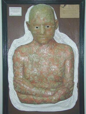 1.Un molde de cera realizado a escala 1:1 policromado, representando la lesión dermatológica y su contorno; éste está rodeado por una tela de gasa o lino de color blanco, que es utilizada para la sujeción de la figura a la tercera y última parte, formada por una tabla de madera pintada de marrón y enmarcada con listones de color negro.