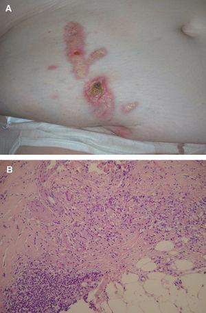 Una mujer de 59 años, apendicectomizada en 1963 e intervenida posteriormente por síndrome del túnel carpiano, acudió al Servicio de Ginecología en 1991 con una placa indurada en la mama izquierda de 2 años de evolución (fig. 1A). En una mamografía se observó un engrosamiento de la piel con mayor densidad del tejido subcutáneo. En la biopsia realizada para descartar infiltración cutánea por carcinoma de mama, se apreció un engrosamiento fibrótico de la dermis y tejido subcutáneo con ausencia de células inflamatorias y de anejos cutáneos (fig. 1B). La paciente no había recibido radioterapia ni tenía historia de implantes mamarios de silicona. Fue remitida al Servicio de Dermatología con el diagnóstico de morfea. En el examen físico se observó una placa indurada y nacarada, de 8 x 6 cm, adherida a tejido subcutáneo en cuadrantes izquierdos de mama izquierda. La paciente no tenía fenómeno de Raynaud ni clínica sistémica. Se realizó una analítica general que fue normal. La serología para Borrelia burgdorferi fue negativa, así como los anticuerpos antinucleares, incluido anti-Scl 70. Estuvo en tratamiento con clobetasol tópico de forma intermitente y cloroquina 250 mg/día durante 12 meses. Tras una progresión inicial de 4 años la placa ha permanecido estable. En una de las visitas de seguimiento, en el año 2001, refirió una lesión de un año de evolución sobre la cicatriz de apendicectomía. En la exploración se observó una placa violácea de borde indurado con una zona central amarillenta con telangiectasias, ulcerada parcialmente, que se disponía de forma longitudinal siguiendo el trayecto de la cicatriz (fig. 2A). Se tomó una biopsia en la que se observaron granulomas con histiocitos, células multinucleadas, linfocitos y células plasmáticas, dispuestos en empalizadas y en filas paralelas en dermis y tejido subcutáneo, junto con focos de colágeno degenerado (fig. 2B). Con el diagnóstico de NL, se realizó un análisis de sangre en el que se detectó una glucemia de 172 mg/dl. Fue tratada con clobetasol tópico y ácido fusídico en el área ulcerada, con reepitelización completa de la misma. En el momento actual la placa de morfea permanece estable y la NL ha mejorado ligeramente. No han aparecido nuevas lesiones de NL sobre las cicatrices de la cirugía del túnel carpiano.