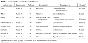 La necrobiosis lipoídica (NL) es una dermatosis de causa desconocida que cursa con una alteración del colágeno y se localiza preferentemente en el área pretibial de pacientes diabéticos 3. Su localización en cicatrices es una manifestación del fenómeno de Koebner que se ha reflejado rara vez en la literatura médica 4-10.