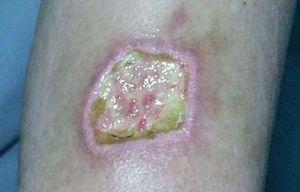 La úlcera se trató con pomadas antibióticas y desbridamientos quirúrgicos periódicos, cerrando por segunda intención en 7 meses (fig. 4).
