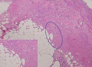 Las exploraciones complementarias realizadas, hemograma, estudio completo de la coagulación, bioquímica y los cultivos bacteriológicos repetidos del exudado fueron normales. Se realizó una biopsia punch de la lesión y el estudio histológico concluyó en una paniculitis necrótica sin evidencia de fenómenos vasculares ni inflamatorios, posiblemente secundaria a tratamiento con interferón (fig. 3).