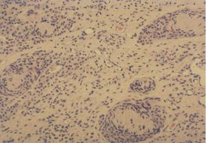 Fig. 3.—Porción profunda del nevo donde se aprecian estructuras con diferenciación neuroide que recuerdan a los corpúsculos de Meissner. (Hematoxilina-eosina, ×100.)