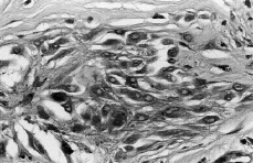 FIG. 2.--Células névicas en tecas superficiales y fascículos profundos rodeadas por gruesos haces colágenos esclerosos (H-E).