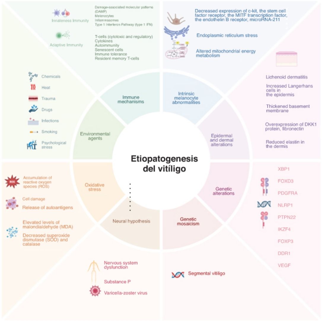 For years, the etiopathogenesis of vitiligo has been a subject of study, and although various theories have been proposed, many questions still remain about its precise causes and underlying mechanisms. In this article, we will explore the most recent research that sheds light on the complex interaction of genetic, autoimmune, neurogenic, and environmental factors contributing to the development and progression of vitiligo. Through a comprehensive review of current literature, we aim to offer an updated view of advances in understanding this enigmatic disease, as well as new therapeutic perspectives emerging from this knowledge.