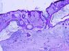 HistopathologyOn histopathology, the epidermis showed mild acanthosis with orthokeratotic hyperkeratosis and marked solar elastosis. Large, fine-walled cystic structures that contained multilayered basophilic keratin were observed in the papillary and superficial reticular dermis. The few sebaceous glands remaining were hypoplastic. The scar of the previous operation was visible beneath the cysts. Some areas of irregular epithelial cords were present between the cyst and the scar, but there was no atypia and the cords were considered to be reactive (Fig. 2).