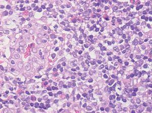 Ante la sospecha clínica de lipoma solicitamos una punción aspirativa con aguja fina (PAAF) cuyo estudio citológico puso de manifiesto la presencia de abundantes linfocitos en diferentes estadios madurativos y algunos eosinófilos. En la analítica destacaba una discreta eosinofilia (10 % de eosinófilos, 790 eosinófilos/mm 3); la bioquímica y los niveles de inmunoglobulina E (IgE) fueron normales. Seguidamente se realizó una biopsia cutánea (figs. 2 y 3).
