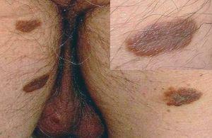 Fig. 1.—Máculas y pápulas marrones y eritematovioláceas localizadas en muslos.