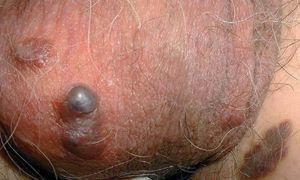 Un varón de 75 años consultó por lesiones eritema-tosas violáceas asintomáticas de 7 meses de evolución, que se iniciaron en el escroto y se extendieron a muslos y piernas. Como antecedentes personales destacaba que era ex fumador y padecía un síndrome prostático. Las lesiones se iniciaron como máculas violáceas que pronto se transformaron en placas y nódulos.