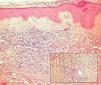 Fig. 3.—Epidermis ortoqueratósica y dermis con neoformación vascular e infiltrado inflamatorio. (Hematoxilina-eosina, ×10.) En el recuadro se observa la presencia de abundantes vasos de diferente tamaño con células atípicas, más abundantes en la parte superior izquierda. (Hematoxilina-eosina, ×40.) Obsérvese la presencia de pigmento hemosiderínico junto a la neoformación vascular.