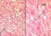 Fig. 4.—A) Capilares con células endoteliales atípicas. (Hematoxili-na-eosina, ×40.) B) Cuerpos de inclusión PAS+. (PAS, ×40.)