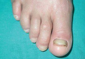 Fig. 1.--Despegamiento de la lámina ungueal del primer dedo del pie derecho, hiperqueratosis subungueal e inflamación del rodete por el que a la presión fluía exudado.