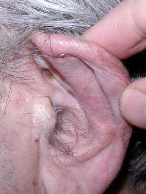 Un varón de 80 años acudió a consulta por dolor a la presión en ambos pabellones auriculares. Como talador de árboles en alta montaña estuvo expuesto a bajas temperaturas sin relatar episodios de congelación. El paciente refería rigidez auricular progresiva de años de evolución. No presentaba otros antecedentes médicos de interés.