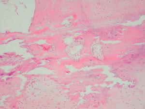 Se realizó toma de biopsia incisional en polo superior de hélix demostrándose en el estudio anatomopatológico degeneración fibrilar del cartílago, áreas de calcificación y metaplasia ósea (fig. 2). En la analítica general, que incluyó calcio, fósforo, fosfatasa alcalina, hormona paratiroidea y cortisol basal, no se observaron alteraciones.