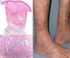 (a) Epidermis normal, con lesiones centradas en la dermis y el tejido celular subcutáneo (hematoxilina-eosina, ×4). (b) Necrosis fibrinoide e infiltrado neutrofílico en los vasos de mediano calibre acompañado de infiltrado eosinofílico (hematoxilina-eosina, ×20). (c) Livedo residual en las piernas, tras inicio de tratamiento con infliximab.