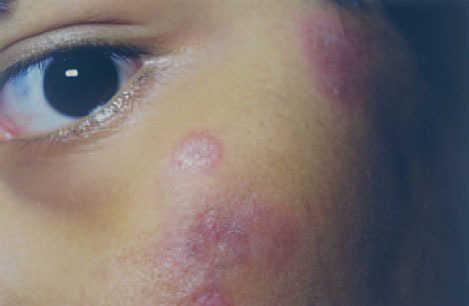 Un varón, de origen mexicano, adoptado, por lo que no se conocen sus antecedentes familiares y entre cuyos antecedentes personales destaca la presencia de una betatalasemia minor, había presentado a los 4 años de edad lesiones faciales que fueron diagnosticadas de LED crónico. Los padres habían rechazado tratamiento, y no se realizó seguimiento clínico. A los 13 años consultó por la aparición desde hacía un año, en tórax y brazos, de lesiones redondeadas, profundas, dolorosas a la palpación. Negaba fiebre, artralgias, aftas orales u otra sintomatología asociada. A la exploración se observaba la presencia, en cara anterior del tórax y parte proximal de extremidades superiores, con carácter bilateral y tendencia simétrica, de nódulos redondeados, bien delimitados, cubiertos unos de piel de coloración normal o rosada, con discreta depresión superficial y otros por piel eritematosa violácea, con escamas adheridas en su parte central (fig. 1). En la región facial se apreciaban placas redondeadas, con borde edematoso eritematoso violáceo y centro discretamente atrófico con gruesa escama adherida y tapones córneos (fig. 2).