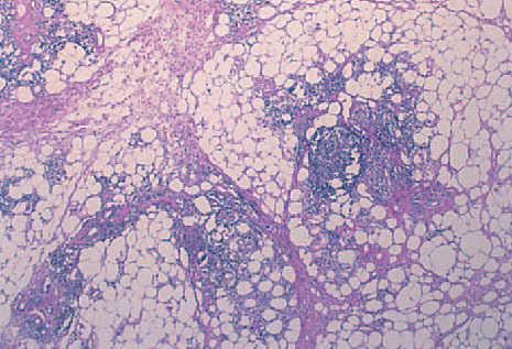 Fig. 3.—Infiltrado linfohistiocitario en septos y lóbulos con formación de centros foliculares en los lóbulos y depósito discreto de mucina. (Hematoxilina-eosina, ×40.)