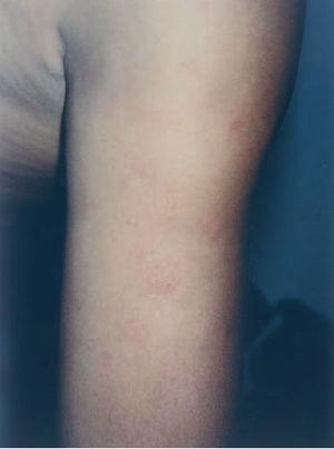 Fig. 1.—Nódulos en parte proximal de brazos, cubiertos por piel rosado-violácea, con fina escama y zonas atróficas deprimidas residuales.