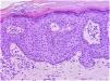 Papular epidermal nevus with “skyline” basal cell layer (PENS) is a variant of epidermal nevus that presents as isolated keratotic papules of variable number and morphology. Histology reveals the following characteristic features: hyperkeratosis; rectangular acanthosis; a palisade basal cell layer; and a wide supranuclear cytoplasmic region that resembles the characteristic “skyline sign” described in Bowen disease. The presence of a wide acellular region just above the nuclei of the basal cell layer is typical.