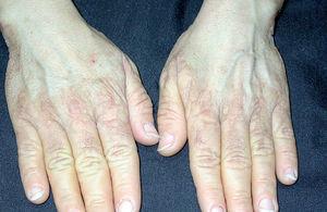 Mujer brasileña de 46 años de edad que consultó por la aparición progresiva desde hacía 6 meses de lesiones verrugosas, aplanadas, múltiples, del color de la piel normal y asintomáticas en el dorso de las manos y en la cara anterior de las muñecas.