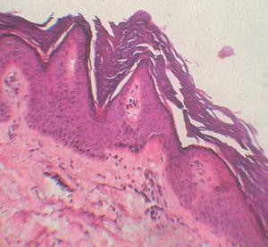 En el estudio histológico se observó hiperqueratosis ortoqueratósica compacta y elevaciones circunscritas epidérmicas en forma de «chapitel de iglesia». Destacaba una acantosis regular con hipergranulosis y no había signos de disqueratosis ni acantolisis.