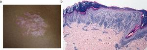 Un varón de 24 años con antecedentes personales de vitíligo localizado en manos, tobillos y genitales, tratado con corticoide y tacrolimus tópicos sin mejoría. El paciente consultó por la aparición reciente de una lesión cutánea pruriginosa en la rodilla derecha. No refería la aplicación de productos tópicos, traumatismos, picaduras, fotoexposición ni la toma de medicamentos orales. A la exploración se observaban pápulas eritematovioláceas brillantes, induradas, confluentes, irregulares con una disposición reticulada, sobre una base maculosa acrómica de color blanquecino (fig. 1a). Se realizó una biopsia cutánea con hallazgos de dermatitis liquenoide con infiltrado linfocitario perivascular y en banda, con afectación del infundíbulo piloso, y ausencia significativa de melanocitos en la capa basal con tinción para MelanA en la inmunohistoquímica (fig. 1b). Se confirmó el diagnóstico de liquen plano sobre vitíligo y se pautó tratamiento con corticoides tópicos sin mejoría clínica.