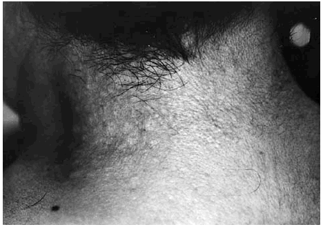 Fig. 1.--Caso 1. Pápulas blanco-amarillentas en caras laterales y posterior del cuello.