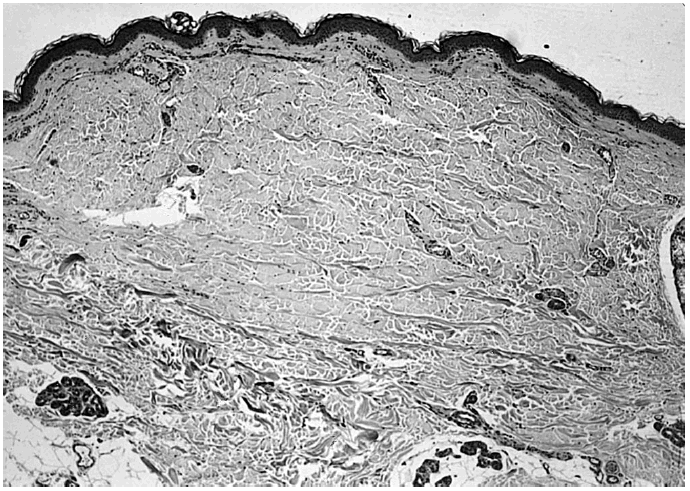 El estudio histopatológico evidenció únicamente una discreta atrofia epidérmica y un engrosamiento de las fibras colágenas en la dermis reticular en una de las biopsias (paciente 1) (fig. 3). En ninguna muestra histológica se evidenció elastosis actínica.
