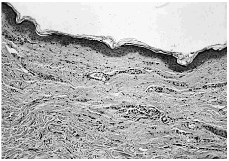 Fig. 3.--Mínima atrofia epidérmica. Engrosamiento de las fibras de colágena en la dermis reticular (H-E, ×40).