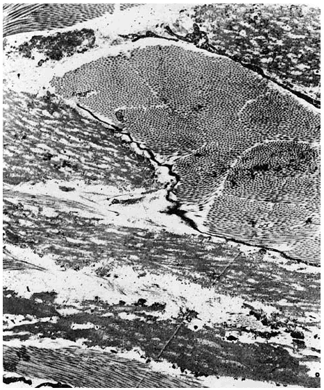 Fig. 6.--Estudio ultraestructural: fibras elásticas con un aspecto rare-facto y poroso (uranil acetato y citrato de plata ×30.000).