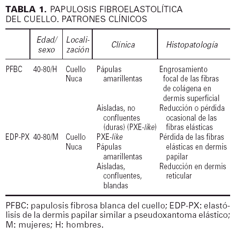 Bajo los términos elastólisis dérmica papilar similar al pseudoxantoma elástico (EDP-PX)1-5 y papulosis fibrosa blanca del cuello (PFBC)6-14 se han definido un grupo de lesiones adquiridas idiopáticas, no inflamatorias, localizadas en el cuello y la nuca, observadas habitualmente en individuos de edad avanzada, que combinan una imagen clínica que recuerda al pseudoxantoma elástico con el hallazgo histopatológico de elastólisis de la dermis papilar (EDP-PX) y/o de un engrosamiento de la colágena en la dermis superficial (PFBC).