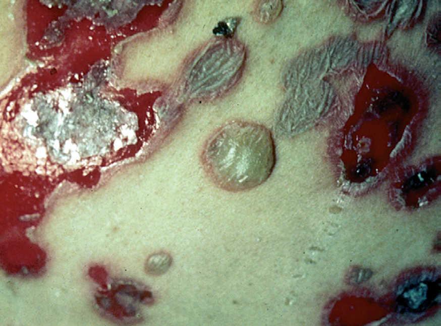 La ampolla es el elemento eruptivo primordial y habitualmente exclusivo 115-118. Tiene un tamaño variable entre el de un guisante y el de una nuez, de color transparente, amarillento o hemorrágico (fig. 2). En ocasiones el contenido de la misma puede ser seroso y purulento. La ampolla habitualmente es de consistencia flácida (fig. 3), aunque en ocasiones se encuentra a tensión. Estas lesiones pueden confluir con ampollas vecinas para adquirir mayor tamaño, o pueden aumentar periféricamente de tamaño dejando en el centro una placa erosivo-costrosa (fig. 4). Clásicamente se ha establecido como característico el hecho de que la ampolla aparezca sobre la piel sana. Aunque ello ocurre en la mayoría de las veces, este hecho no es constante y en ocasiones sólo se pone de manifiesto en las primeras horas de evolución de la ampolla. En otras la ampolla se rodea de un halo inflamatorio que puede ser más ostensible cuando el contenido de la ampolla se hace purulento (fig. 5).