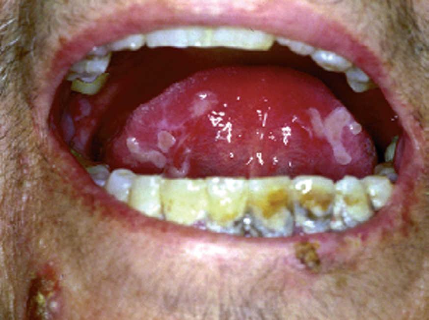 Fig. 8.--Lesiones erosivas y costrosas en lengua.