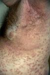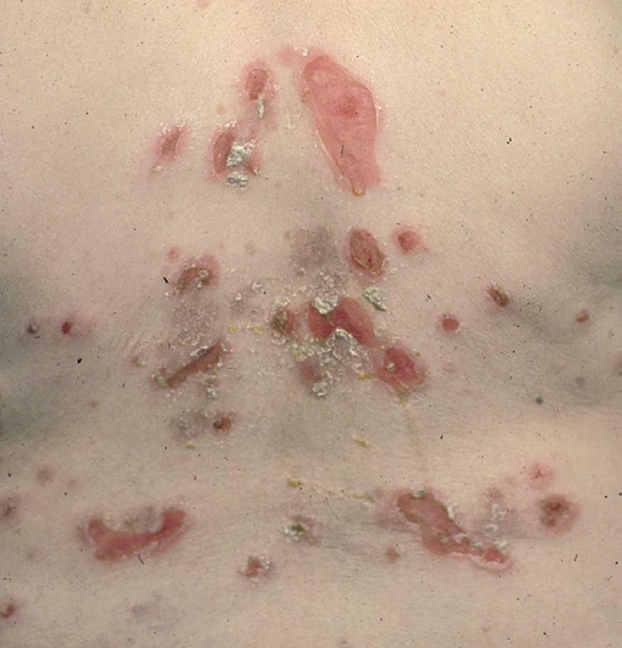 Las lesiones inicialmente se localizan en cuero cabelludo, cara, cuello, tórax y espalda, aunque puede aparecer en cualquier región de la superficie corporal (fig. 15). Las lesiones pueden estar limitadas a estas zonas, pero en la mayoría de los casos se diseminan en semanas o meses, por la confluencia de lesiones previas y aparición de nuevas lesiones. Las erosiones pueden diseminarse dando lugar a una eritrodermia (fig. 16). Es característico que la mucosa oral esté respetada. El cuadro clínico habitualmente es crónico.