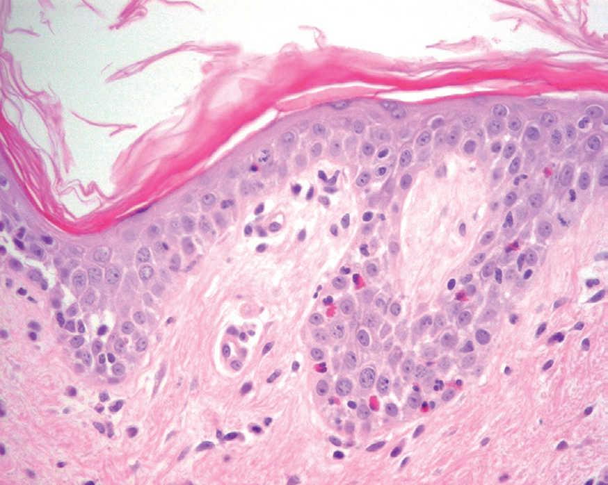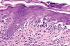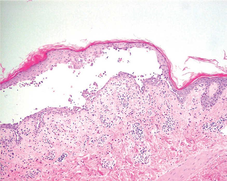 La histopatología es muy polimorfa, con hallazgos que varían en función del tipo de lesión cutánea y de la evolución del cuadro clínico 3. La presencia de vesículas intraepidérmicas, o ampollas subcórneas 222 que están llenas de neutrófilos y eosinófilos en proporción variable es un hallazgo característico (fig. 28). En algunas ocasiones se precisan varias biopsias para llegar a un diagnóstico correcto 6,220, con discreta acantolisis en las capas superiores de la epidermis y espongiosis eosinofílica.