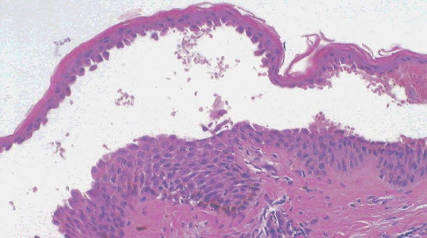 La primera alteración que se observa en la histopatología del PV es un edema intercelular que se localiza en las capas más inferiores de la epidermis, con desaparición de los puentes intercelulares, conduciendo así al fenómeno de acantolisis. Cuando la acantolisis progresa da lugar a la ampolla intraepidérmica suprabasal cuyo suelo está formado por una hilera de células basales, que se ha dicho que se disponen como una «hilera de lápidas sepulcrales», y cuyo techo se encuentra constituido por el resto de la capa espinosa, las capas granulosas y la córnea (fig. 19). En el interior de la ampolla se suelen encontrar queratinocitos acantolíticos, bien de manera aislada o en grupos, con una apariencia característica, cuya morfología es redondeada en lugar de poligonal, con un núcleo pequeño e hipercromático, con frecuencia rodeado de un halo y citoplasma homogéneo.