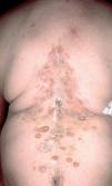 Fig. 27.--Ampollas y erosiones en la espalda delimitadas por pápulas, vesículas y pústulas. Cortesía de Arranz D. et al. Pénfigo herpetiforme asociado a carcinoma del esófago. Actas Dermosifiliogr 2005;96:119-121.