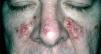 El pénfigo eritematoso es una variante clínica localizada de PF con placas eritematosas descamativas y costrosas, habitualmente en la región centrofacial y otras veces en la región submamaria o preesternal que recuerdan a las lesiones de lupus eritematoso (fig. 17). En un porcentaje que oscila entre el 30 y el 80 % se observan en el suero anticuerpos antinucleares. El PF o eritematoso es la forma de presentación clínica más frecuente en el pénfigo inducido por medicamentos del grupo tiol, como la D-penicilamina (fig. 18).