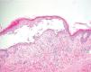 Los hallazgos histopatológicos son muy variables, en función del tipo de lesión clínica examinada. Las biopsias de las lesiones orales muchas veces muestran una inflamación inespecífica y puede observarse acantolisis suprabasal en el epitelio perilesional. En la piel se puede encontrar desde una ampolla suprabasal con acantolisis hasta una inflamación liquenoide intensa (fig. 25). En la revisión realizada por Horn y Anhalt 205, se encuentran como datos más importantes la acantolisis epidérmica con formación de hendiduras suprabasales, queratinocitos disqueratósicos junto con degeneración vacuolar de los queratinocitos basales y exocitosis epidérmica de células inflamatorias. De acuerdo con ellos la asociación de acantolisis suprabasal y de la necrosis de queratinocitos y/o vacuolización de la capa basal es muy característica del PPN. La asociación de ampollas y acantolisis no tiene nada de peculiar con respecto al PV y es la asociación de la necrosis de los queratinocitos y la ausencia de espongiosis eosinofílica la que sugeriría el cuadro. Las lesiones liquenoides presentan áreas en las que se reconoce un infiltrado linfocitario en dermis superficial con linfocitos individuales infiltrando el epitelio con ocasionales necrosis celulares aisladas.