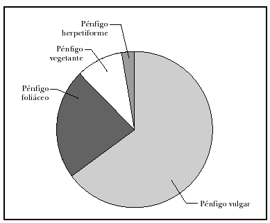 El pénfigo vulgar es la variedad más frecuente y representa aproximadamente el 70 % de todas las formas de pénfigo2. Todos los pacientes con pénfigo vulgar tienen afectación de mucosa y más de la mitad tienen también ampollas y erosiones que afectan la piel. Las ampollas en el pénfigo vulgar aparecen en la parte más profunda de la epidermis, justo por encima de la capa basal. Los enfermos con pénfigo foliáceo tienen sólo lesiones cutáneas, sin afectación mucosa; el despegamiento se produce a nivel de las capas más superficiales de la epidermis, principalmente en la capa granulosa. El pénfigo eritematoso o seborreico y el «fuego salvaje» representan las formas localizadas y endémicas del pénfigo foliáceo, respectivamente.