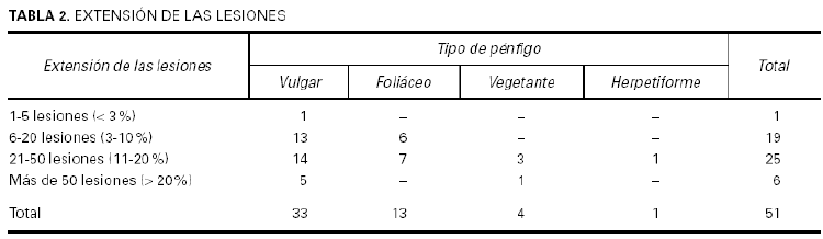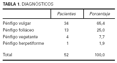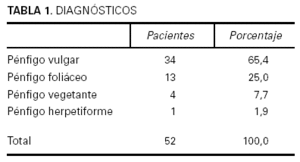 Se revisan de forma retrospectiva los pacientes con pénfigos atendidos en el Servicio de Dermatología del Hospital 12 de Octubre de Madrid entre enero de 1972 y enero de 2003. Encontramos 52 pacientes que cumplían criterios clínicos, histológicos y la mayoría también inmunohistoquímicos. Se han analizado los siguientes datos de cada paciente: edad, sexo, sintomatología, tiempo de evolución hasta el diagnóstico, histología, inmunohistoquímica, inmunofluorescencia indirecta, tratamiento, complicaciones, recidivas y evolución. También se analizó la extensión de las lesiones y se distinguieron cuatro grupos: entre 1 y 5 lesiones (< 3 % superficie afectada), entre 6 y 20 lesiones (3-10 %), entre 21 y 50 lesiones (11-20 %) y más de 50 lesiones (> 20 %).