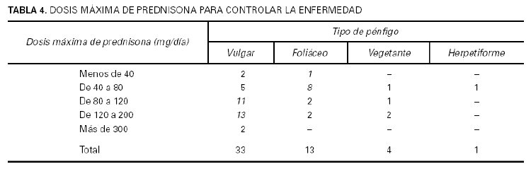 Todos nuestros pacientes fueron tratados inicialmente con corticoides orales siguiendo el siguiente esquema: los casos leves, con pocas lesiones, con prednisona, 20 mg/día; los casos más extensos y graves o los leves que no respondían a la dosis anterior, con prednisona entre 80-90 mg/día, incrementando la dosis un 50 % cada 4-7 días hasta controlar la actividad de la enfermedad, cese de aparición de nuevas lesiones y remisión del prurito o dolor. Esta dosis se mantenía hasta que la mayoría de las lesiones (más del 80 %) curaban y después se disminuía de manera progresiva. Cuando la dosis necesaria para controlar la enfermedad era muy alta (> 240 mg/día) o aparecían complicaciones, se introducía también algún tratamiento adyuvante. Todos nuestros pacientes respondieron favorablemente al tratamiento con corticoides orales; la mayoría de los pacientes con pénfigo vulgar (72 %) precisaron una dosis máxima de prednisona para controlar la enfermedad entre 80-200 mg/día, mientras que la mayoría de los enfermos con pénfigo foliáceo (69 %) precisaron menos de 80 mg/día de prednisona. La mayoría de nuestros pacientes recibió algún tipo de tratamiento adyuvante, el más frecuente la azatioprina a dosis entre 100 y 150 mg/día; los efectos adversos más frecuentes del tratamiento fueron la leucopenia y la trombopenia leves, como se describe en otras series2. Según nuestra experiencia, el tratamiento más eficaz y seguro para el tratamiento del pénfigo son los corticoides orales (entre 80-200 mg/día si hablamos de pénfigo vulgar y menos de 80 mg/día en casos de pénfigo foliáceo) combinados con azatioprina.