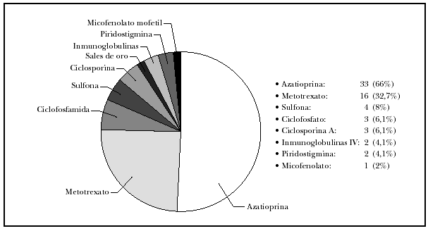 Todos nuestros pacientes fueron tratados inicialmente con corticoides orales, empezando con una dosis de aproximadamente 1 mg/kg/día e incrementando un 50 % cada 4-7 días hasta controlar la actividad (cese de aparición de lesiones y remisión del prurito y/o dolor). Tras controlar la actividad se mantuvo la misma dosis hasta que remitían el 80-90 % de las lesiones, y después se reducía paulatinamente. En nuestra serie, la dosis máxima de prednisona requerida para controlar la enfermedad en la mayoría de los enfermos con pénfigo vulgar y vegetante (72 %) fue entre 80 y 200 mg/día, mientras que la mayoría de los enfermos con pénfigo foliáceo (69 %) precisó menos de 80 mg/día (tabla 4). Respecto a los tratamientos adyuvantes (fig. 5), éstos se emplearon en casi todos los pacientes; el más usado fue la azatioprina (en 33 pacientes, 66 %) seguida del metotrexato (en 16, 32,7 %). Se utilizó piridostigmina oral en 2 pacientes con pénfigo vulgar grave con poca respuesta, y micofenolato en un solo paciente también con la misma afección, igualmente con poco éxito; no permitió suspender ni disminuir los corticoides orales.