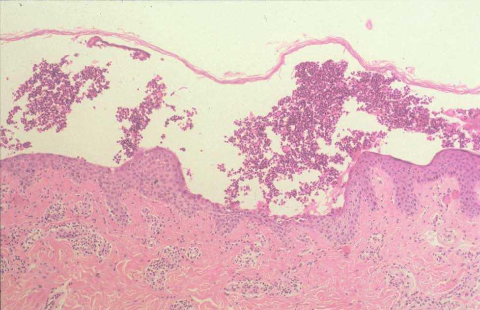Fig. 2.—Pústula intraepidérmica que contiene numerosos eosinófilos y algunas células acantolíticas. (Hematoxilina-eosina, ×20.)