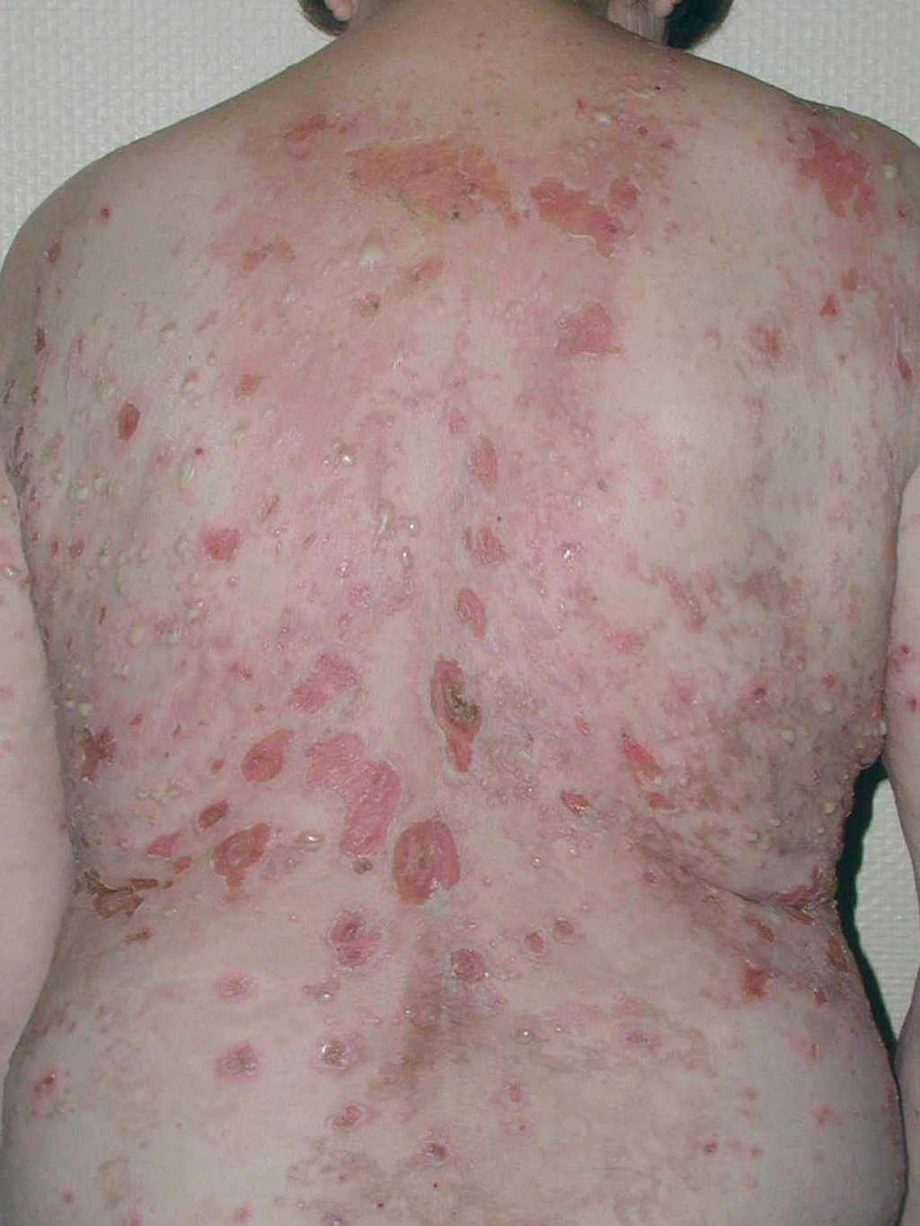 Fig. 3.—Grandes ampollas y erosiones en la espalda. Se aprecian pápulas, vesículas y pústulas en la periferia.